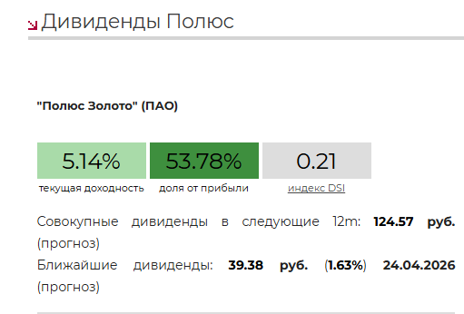 Прогноз на текущий момент — чуть более 5%. Это ниже инфляции и значительно ниже, чем дают многие другие российские компании. По сути, купив Полюс, вы делаете ставку только на рост котировок (и цен на золото), а не на постоянный денежный поток. Дивидендному инвестору здесь ловить нечего.