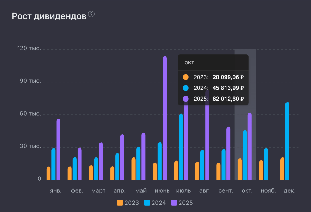 Октябрь уже обошёл по пассивному доходу сентябрь, и это ещё не конец, будут проценты по депозиту и что-то ещё по купонам может досыпаться. Около 80 000 должно быть, в отдельном посте всё подсчитаю.