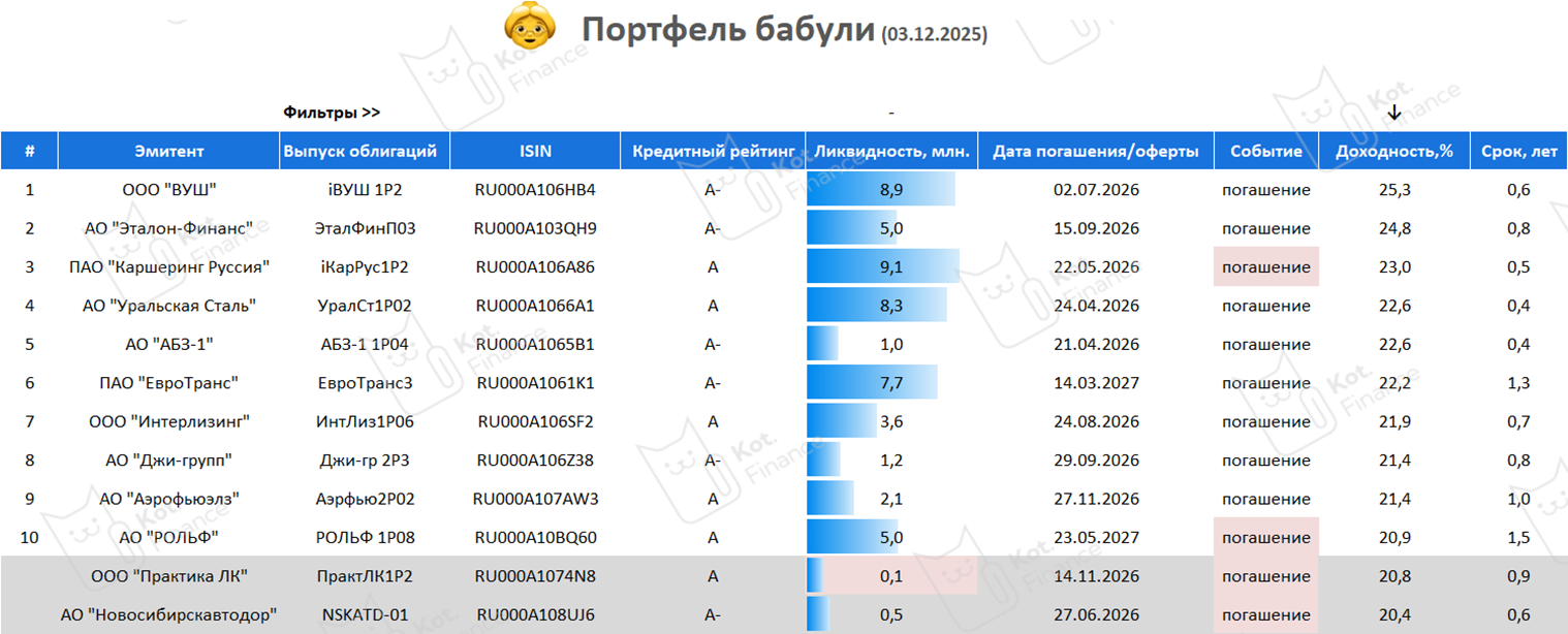 Мы придумали портфель бабули, чтобы предлагать простые и надежные решения, не требующие много времени. Кредитный рейтинг А- и выше – золотая середина (компромисс) между риском и доходностью.