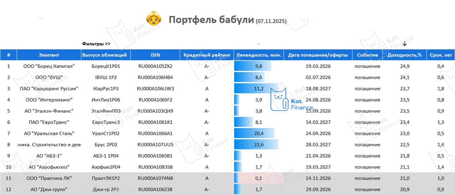 Мы придумали портфель бабули, чтобы предлагать простые и надежные решения, не требующие много времени. Кредитный рейтинг А- и выше – золотая середина (компромисс) между риском и доходностью.