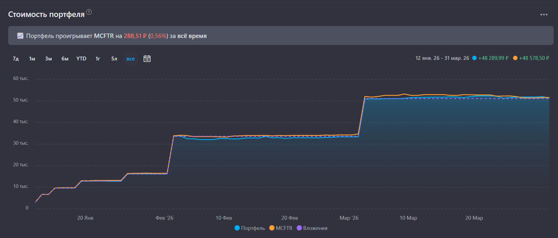 Вложено 52500₽, получено также купонов на сумму — 473,52 (всего — 907,58₽, всё реинвестирую), портфель проигрывает MCFTR на 0,56%. Портфель открытый, все метрики по нему можно просмотреть тут.