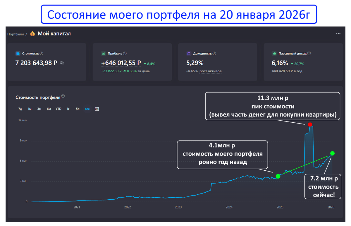 Посмотрел историю, ровно год назад (20 января 2025г) у меня на счету было 4.1млн р! Получается, за год мой портфель вырос на +3 ляма. Неплохо! Надеюсь, смогу придерживаться и дальше такого ежегодного прироста капитала.