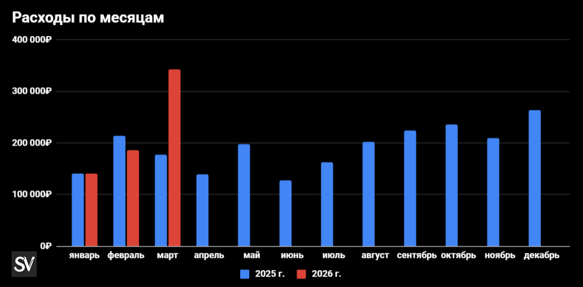 В марте мы потратили 342 368₽ (февраль — 186 628₽), расходы повысились на 93,3% по сравнению с мартом 2025 г., плюсом не уложился в свой максимум. Теперь кратко по категориям: