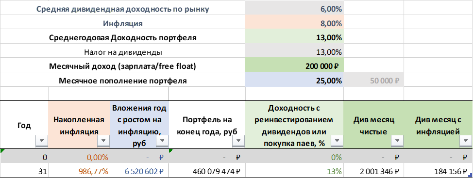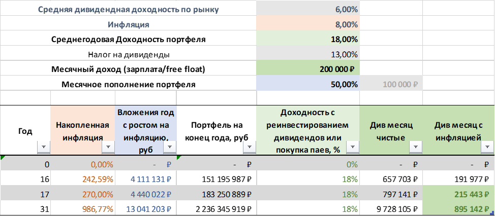 Самое главное: если посмотреть на величину портфеля, то получается, что за 20 лет нужно накопить портфель величиной 200 млн. рублей и даже среднемесячные дивиденды составят около миллиона. В общем инфляция в 8% как-то очень прямо сильно «раскручивает» цифры. Вы даже посмотрите на столбец с вложениями – будете ли вы через 20 лет откладывать по 6 млн.? Цифры - условность, кажутся гигантскими, но кто знает какая будет инфляция в будущем?