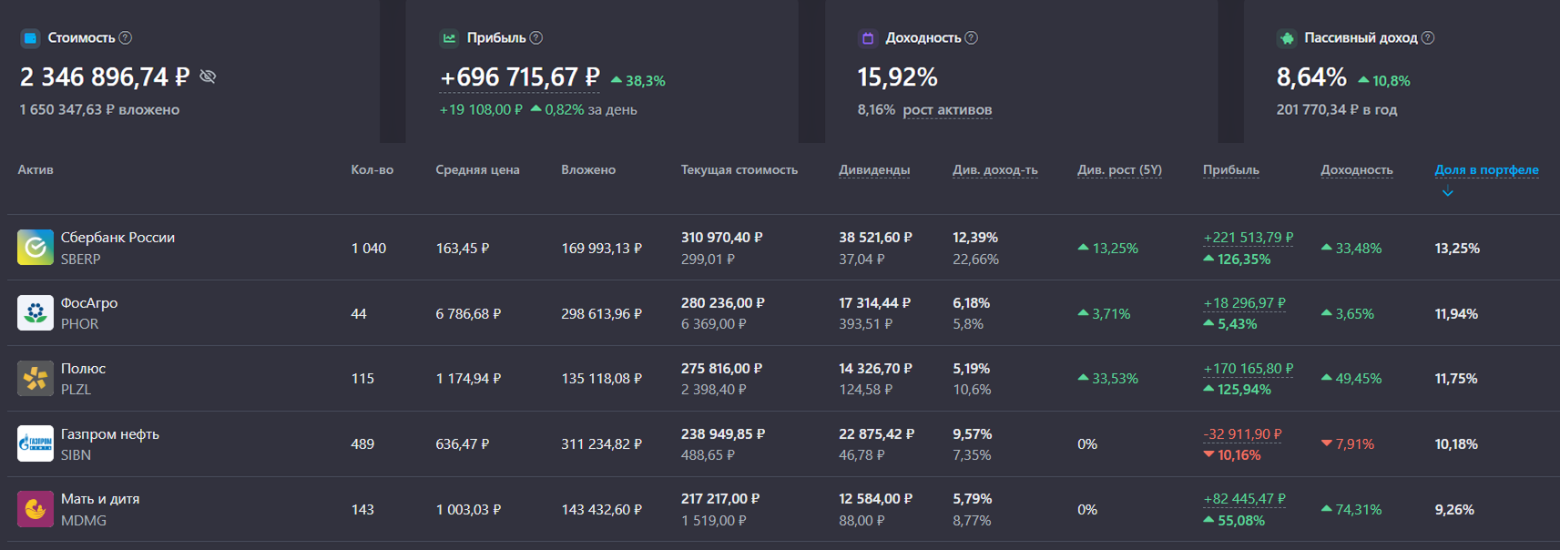 Мой портфель и ТОП-5 акций в нем