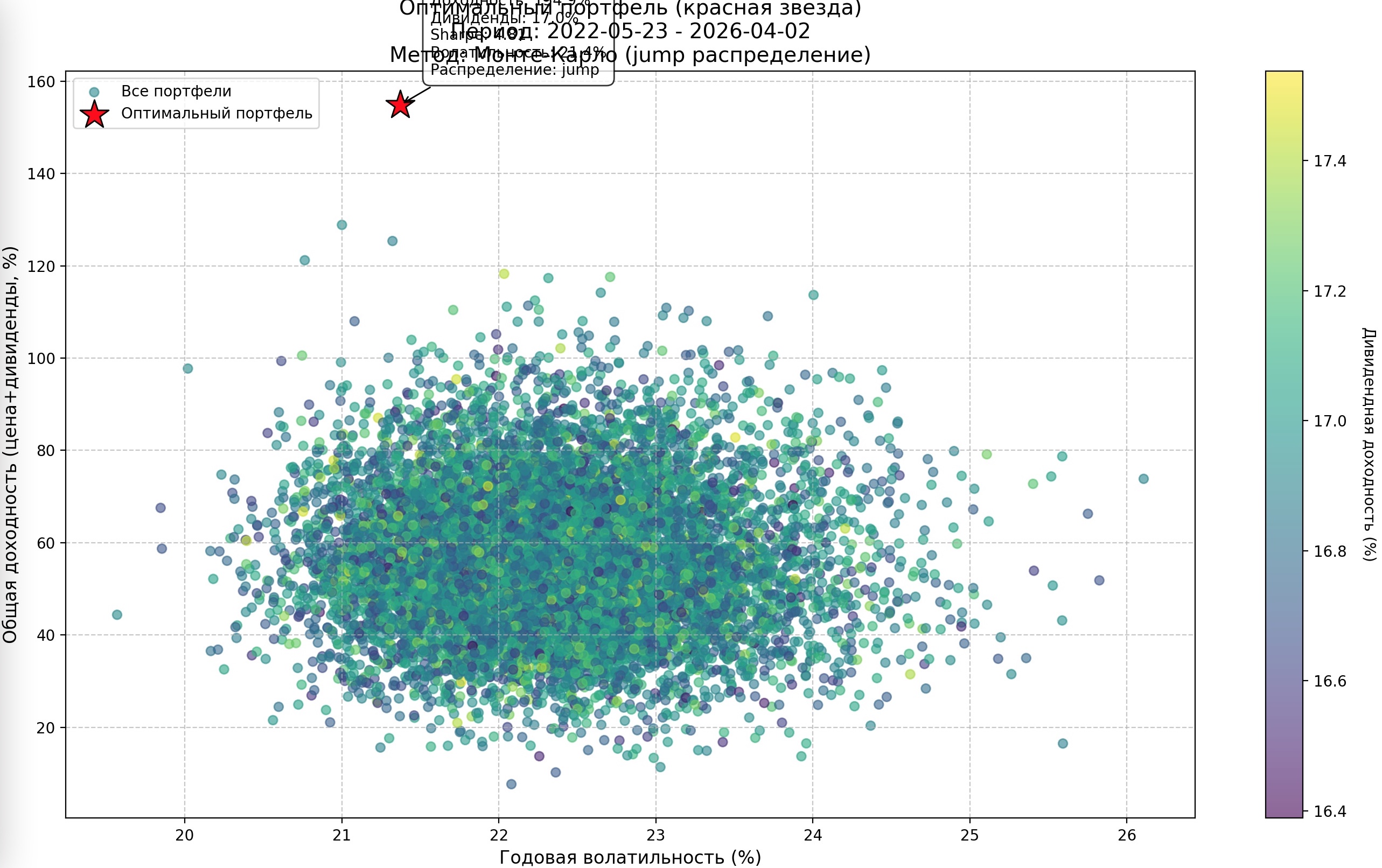 Красная звезда — оптимальный портфель. Он находится вверху чуть слева: высокая общая доходность (~152%) при относительно низкой волатильности (~21,5%). При этом дивидендная доходность нового состава — 17,0% при волатильности 23,4% по данным симуляции. Это тот самый угол, куда наша модель и целится: максимум дохода при приемлемом риске.