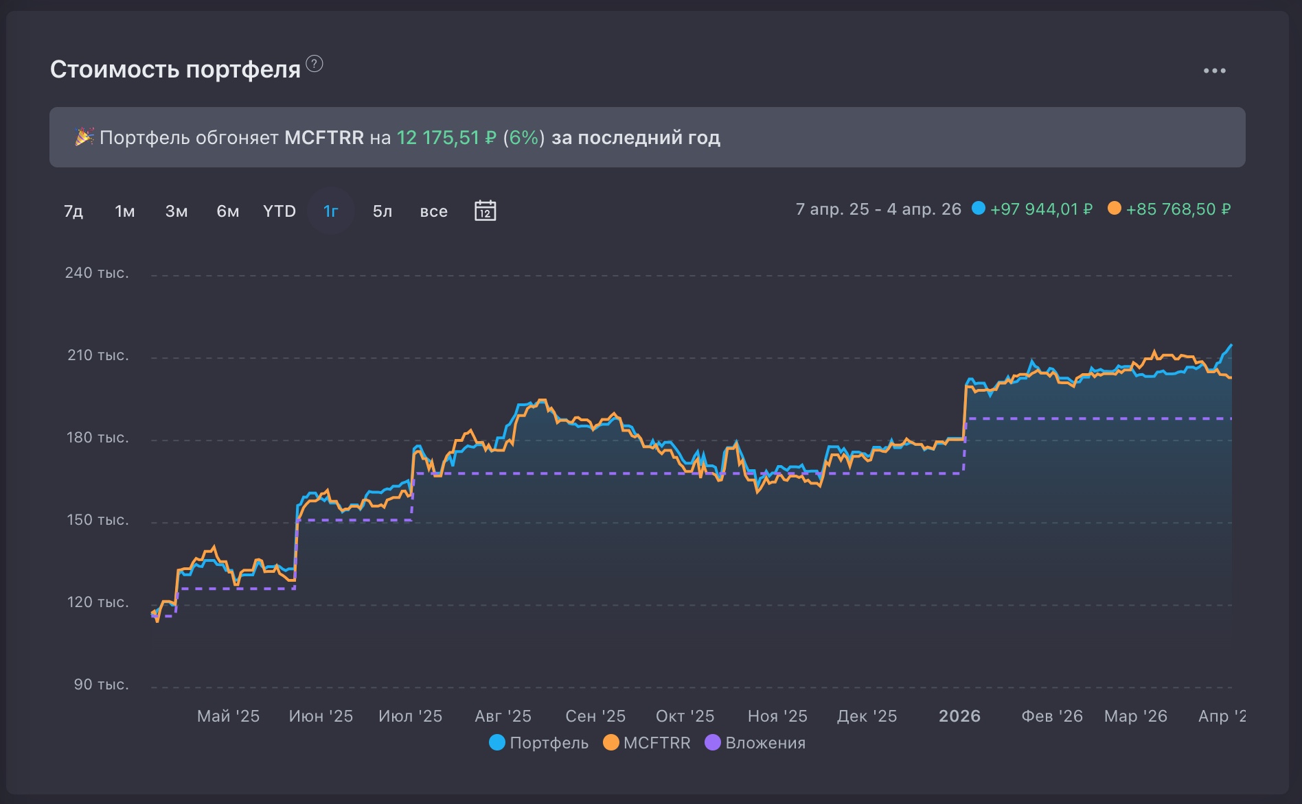 За 12 месяцев — с 7 апреля 2025 по 4 апреля 2026 — портфель вырос с учетом всех вложений на +97 944 ₽, тогда как MCFTRR за тот же период прибавил +85 768 ₽. Опережение индекса составило +12 175 ₽, или +6%.