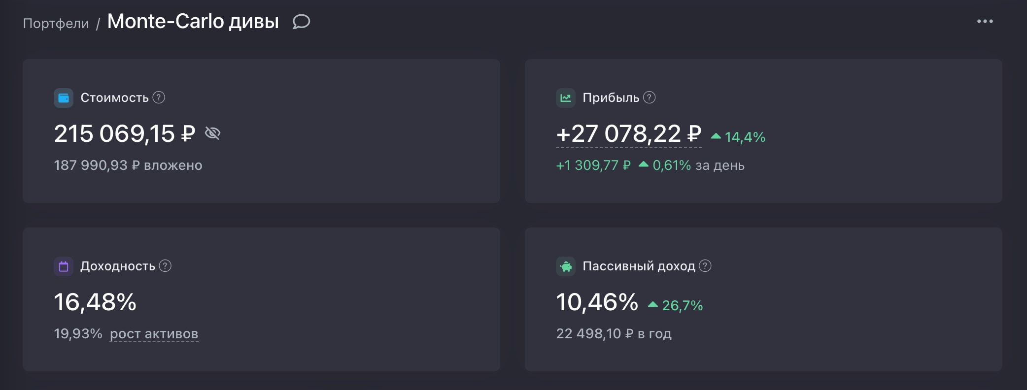 Текущая стоимость портфеля — 215 069 ₽ при вложенных 187 990 ₽. Итоговая доходность — 16,48% (рост активов 19,93%). Прогнозируемый пассивный доход — 10% дивидендами к текущей стоимости. За год этот показатель вырос на +26,7% — наша модель явно нащупала правильные бумаги.