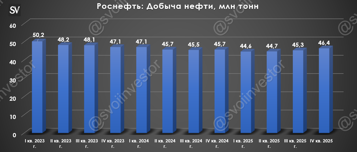 Операционные результаты за IV квартал. Добыча нефти: 46,4 млн тонн (+1,5% г/г, компания приступила к увеличению добычи), в 2025 г. начиная с I кв. происходила компенсация по добыче за ранее превышенные квоты, но со II кв. РФ уже начала наращивать добычу (в 2025 г. РФ добывала нефти в среднем — 9,129 млн б/с vs. 2024 г. — 9,197 млн б/с). Добыча газа: 21,3 млрд куб.м. (+3,9% г/г, рост после 3 кварталом подряд снижения). Переработка нефти: 18 млн тонн (-9,6% г/г, снижение связано с ремонтными работами на НПЗ, как плановыми, так и после атак БПЛА).