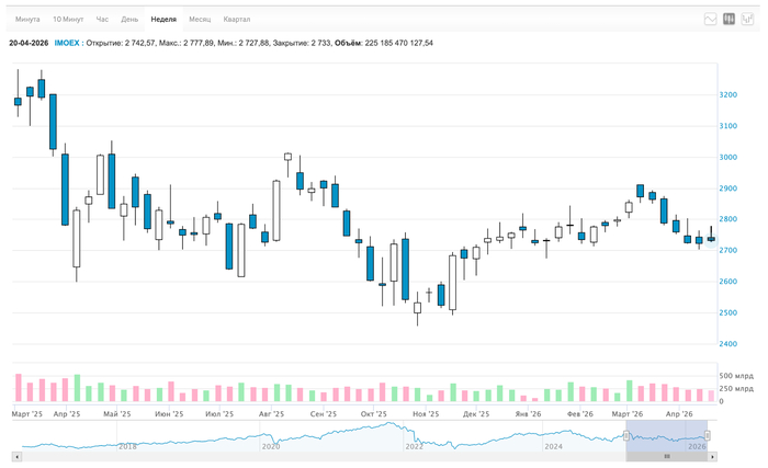 Акции пытались расти на ожидании ключа, но в итоге это не особо вышло. Итоговое изменение IMOEX с 2 723 до 2 733. А ведь доходило до 2 777!
