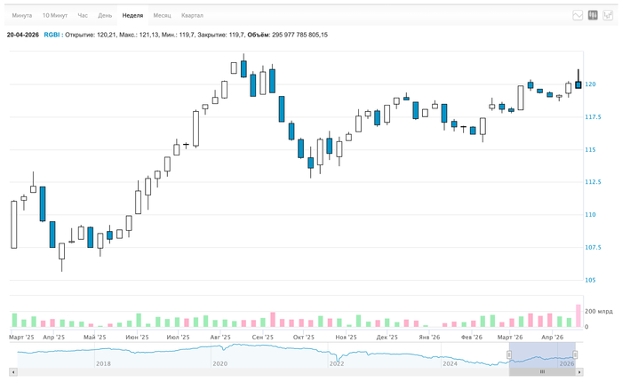 RGBI: 120,0 → 119,7. ОФЗ росли, но испугались слов Набиуллиной. Я продолжаю покупать длинные ОФЗ.
