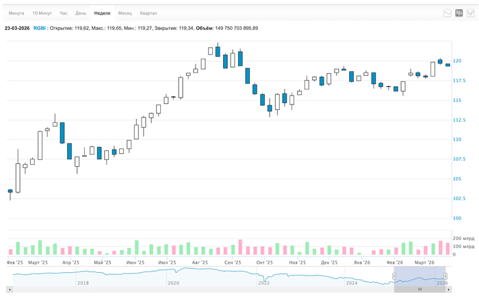 RGBI: 119,7 → 119,3. Ещё немного снизились, но несущественно. Я продолжаю покупать длинные ОФЗ.