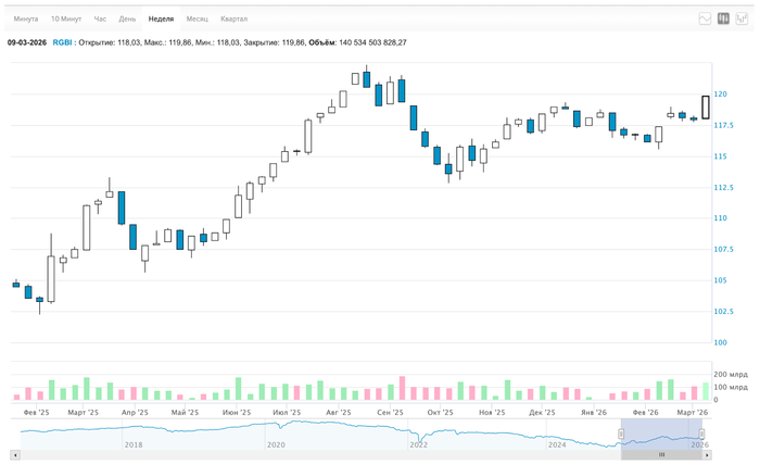 RGBI опять вверх: 117,9 → 119,86. В ожидании заседания ЦБ рост такой?! Я продолжаю покупать длинные ОФЗ.