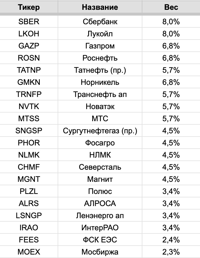 У каждой акции свой вес в портфеле — максимально диверсифицировано, чтобы отказ одного эмитента от выплат не бил слишком больно по общему потоку.