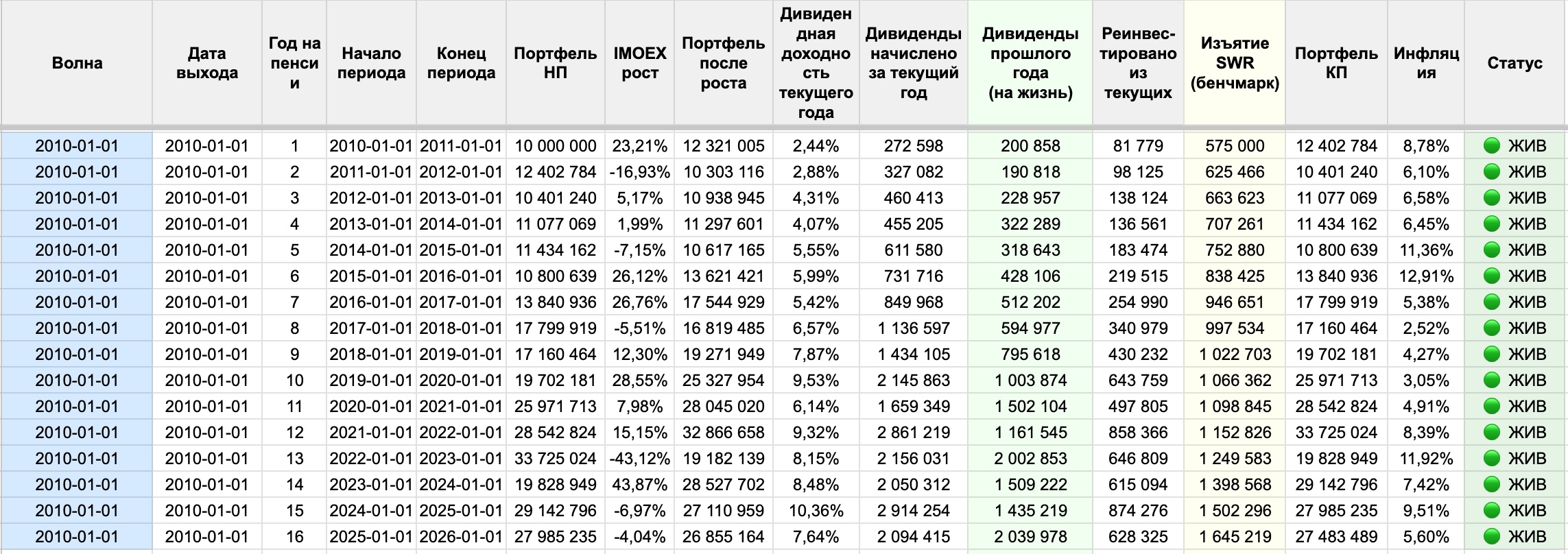 Колонка «Изъятие SWR (бенчмарк)» — сколько бы забирал пенсионер из точно такого же портфеля при классической стратегии SWR со ставкой 5.75%. Эту колонку я добавил специально — чтобы простым сравнением показать разницу между двумя стратегиями прямо здесь.