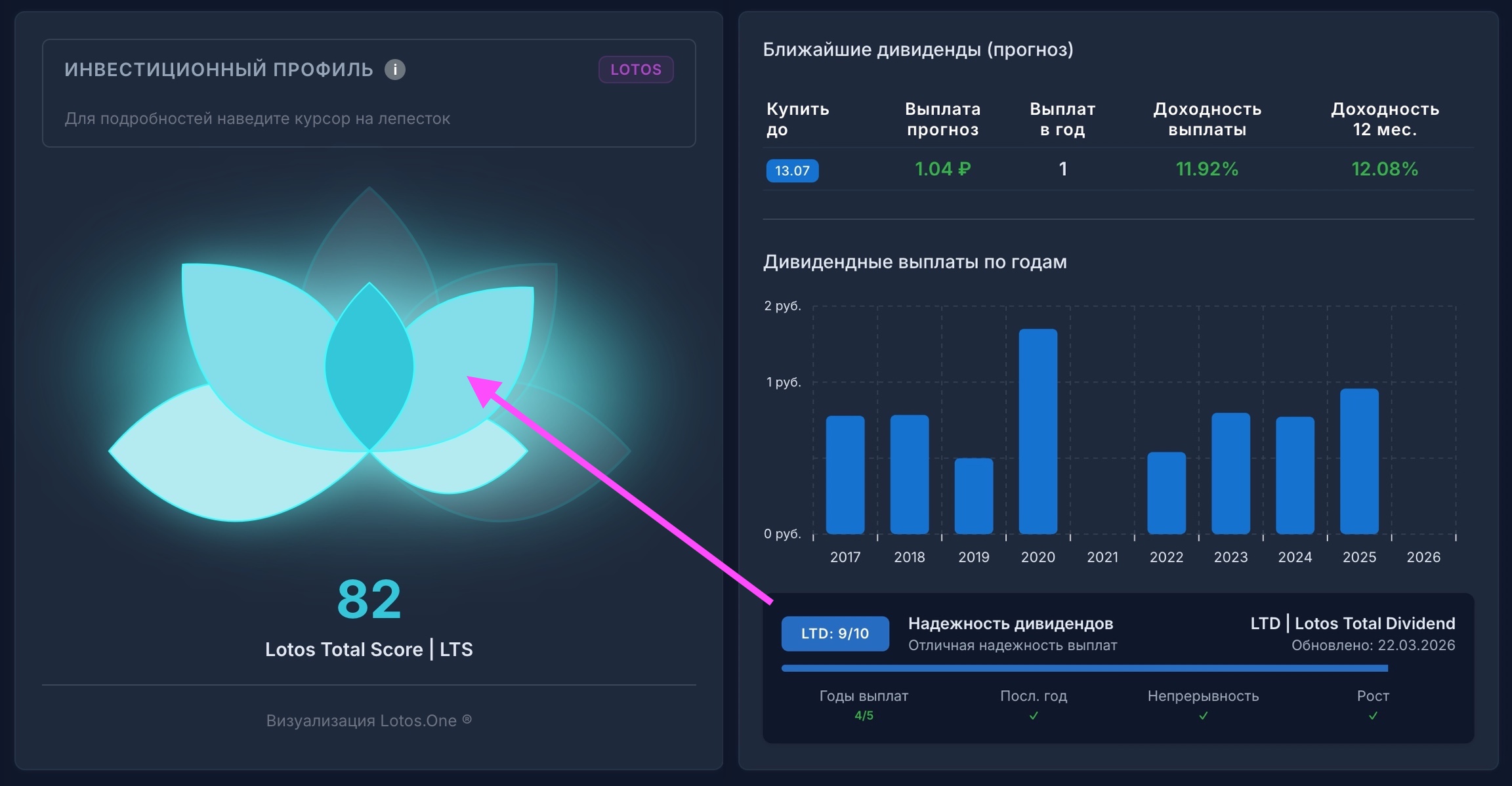 В левой части скриншота Lotos.One четвёртый лепесток показывает общее состояние компании в части дивидендов. Справа на скриншоте — прогноз ближайших выплат, история выплат и пропусков по годам, а также дифференциальный коэффициент LTD (Lotos Total Dividend) от 0 до 10, где 10 — максимальный балл дивидендной надёжности. Чем выше балл, тем стабильнее и щедрее компания платила исторически. Выбираете любой тикер в сервисе — и за пять секунд понимаете, можно ли на эту компанию опираться как на источник дивидендного дохода.