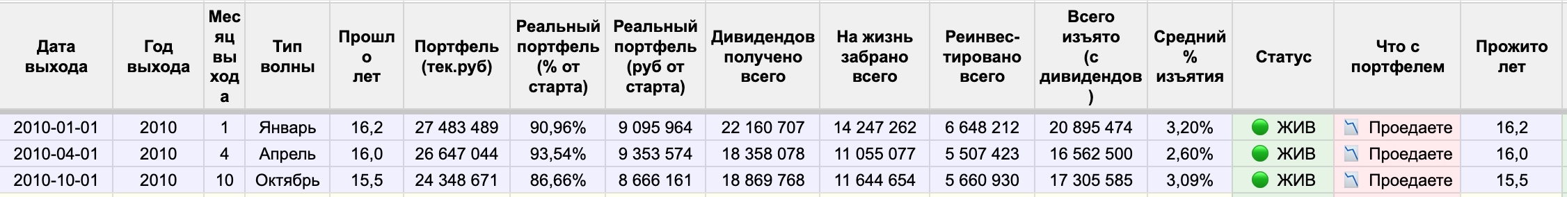 А теперь посмотрите на строку с апрельским выходом: реальный портфель 9 353 574 рубля, то есть 93.5% от стартового. А октябрьский: 8 666 161 рублей — уже 86.7%.