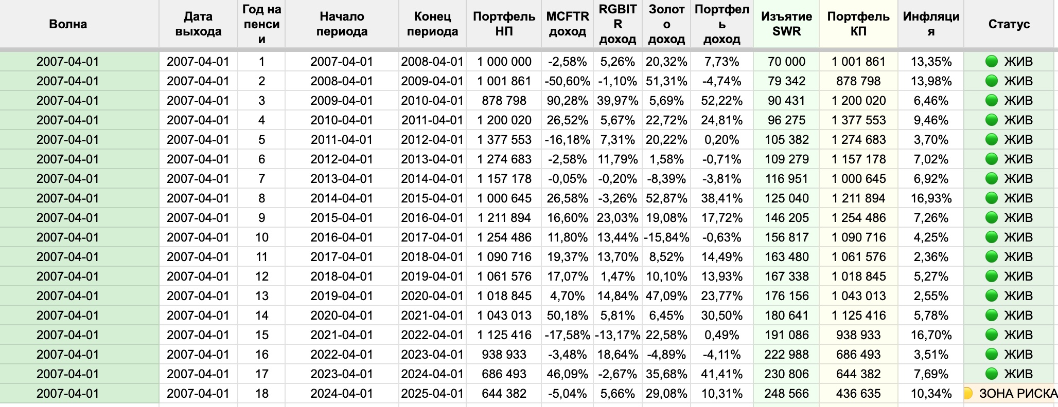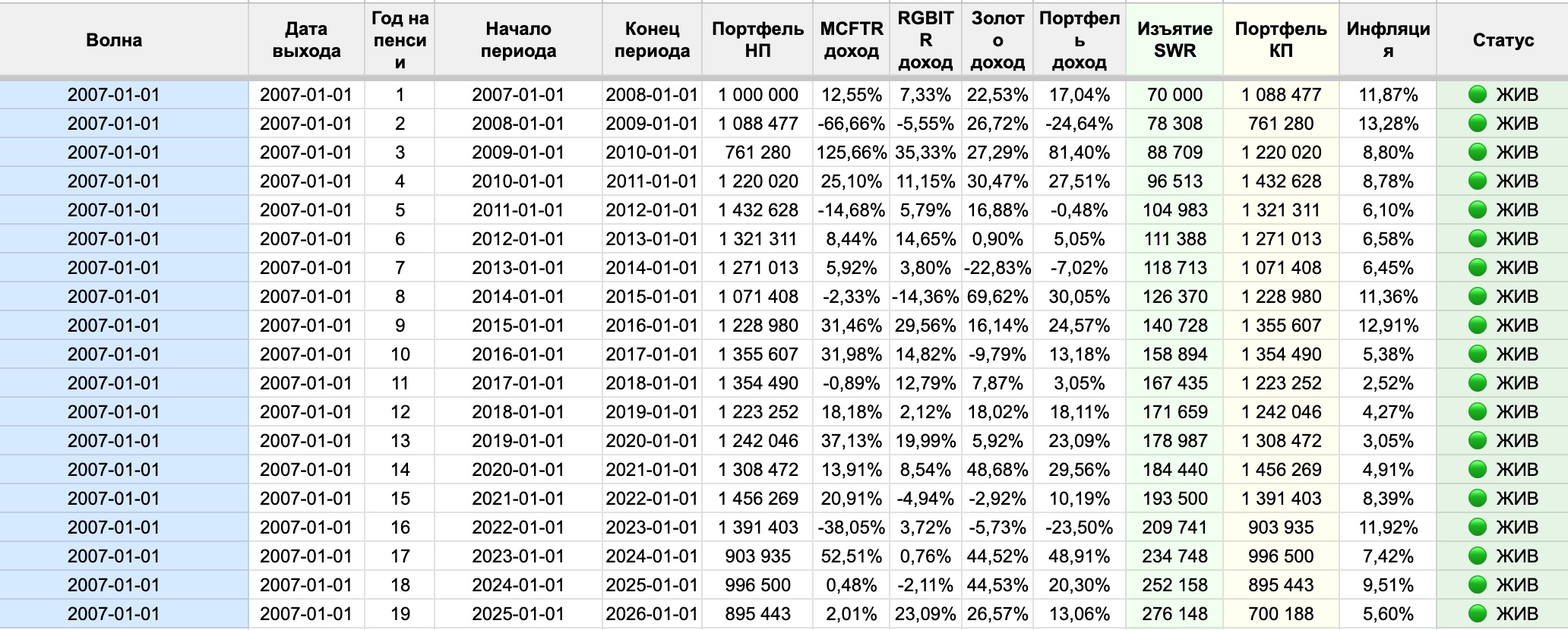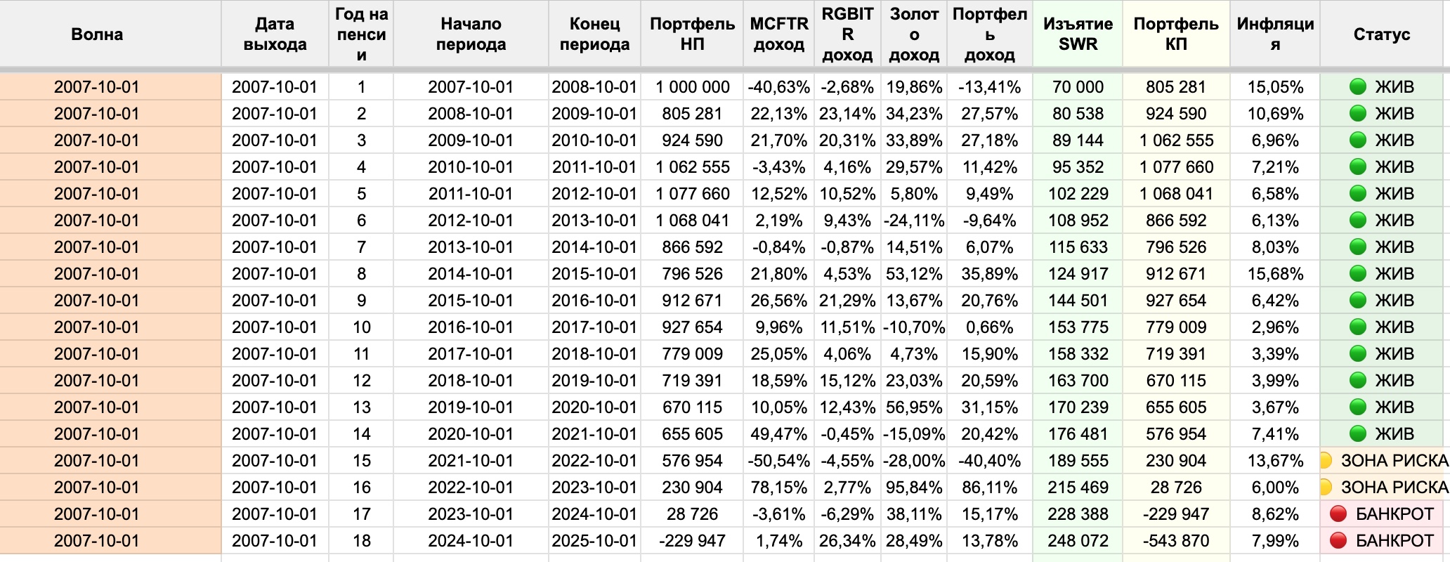 Для российского рынка мы можем сказать то же самое: самый неудачный российский пенсионер — тот, кто вышел на пенсию 1 октября 2007 года. Именно под него будет откалибрована наша безопасная ставка — та самая цифра которую мы выведем в части V. При этой ставке его портфель к 2026 году сохраняет около 29% реальной стоимости — на грани, но жив. Все остальные исторические пенсионеры чувствуют себя лучше — многие накопили 300–400% от стартового капитала.