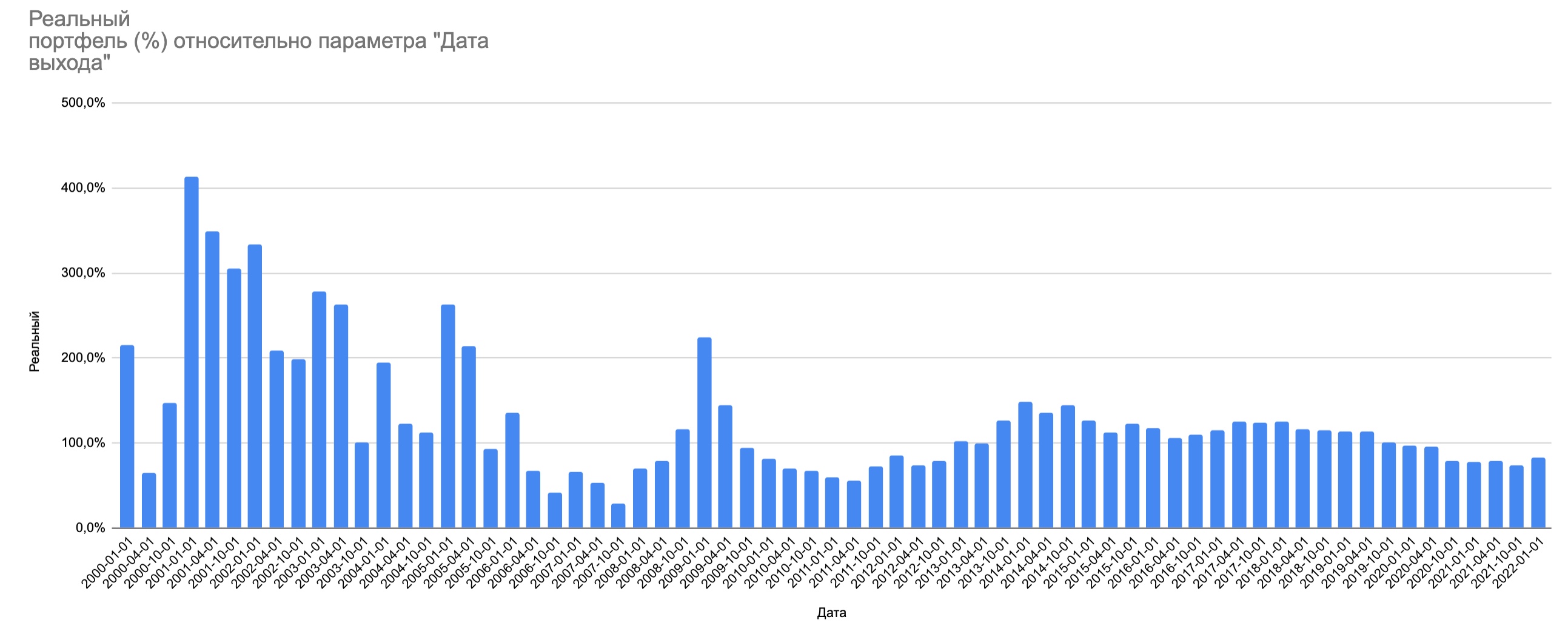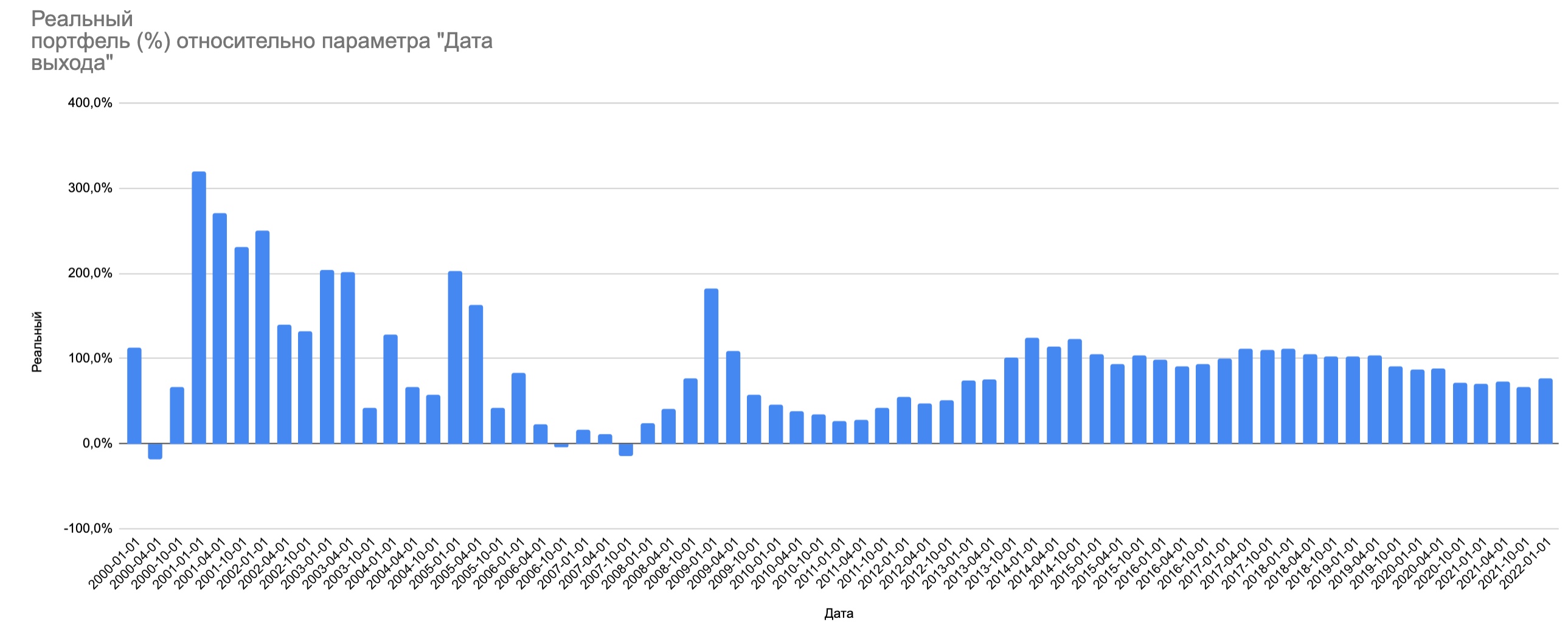 Посмотрите на два графика ниже. По горизонтали — все даты выхода на пенсию с 2000 по 2022 год. По вертикали — реальная стоимость портфеля в процентах от стартового капитала к началу 2026 года.