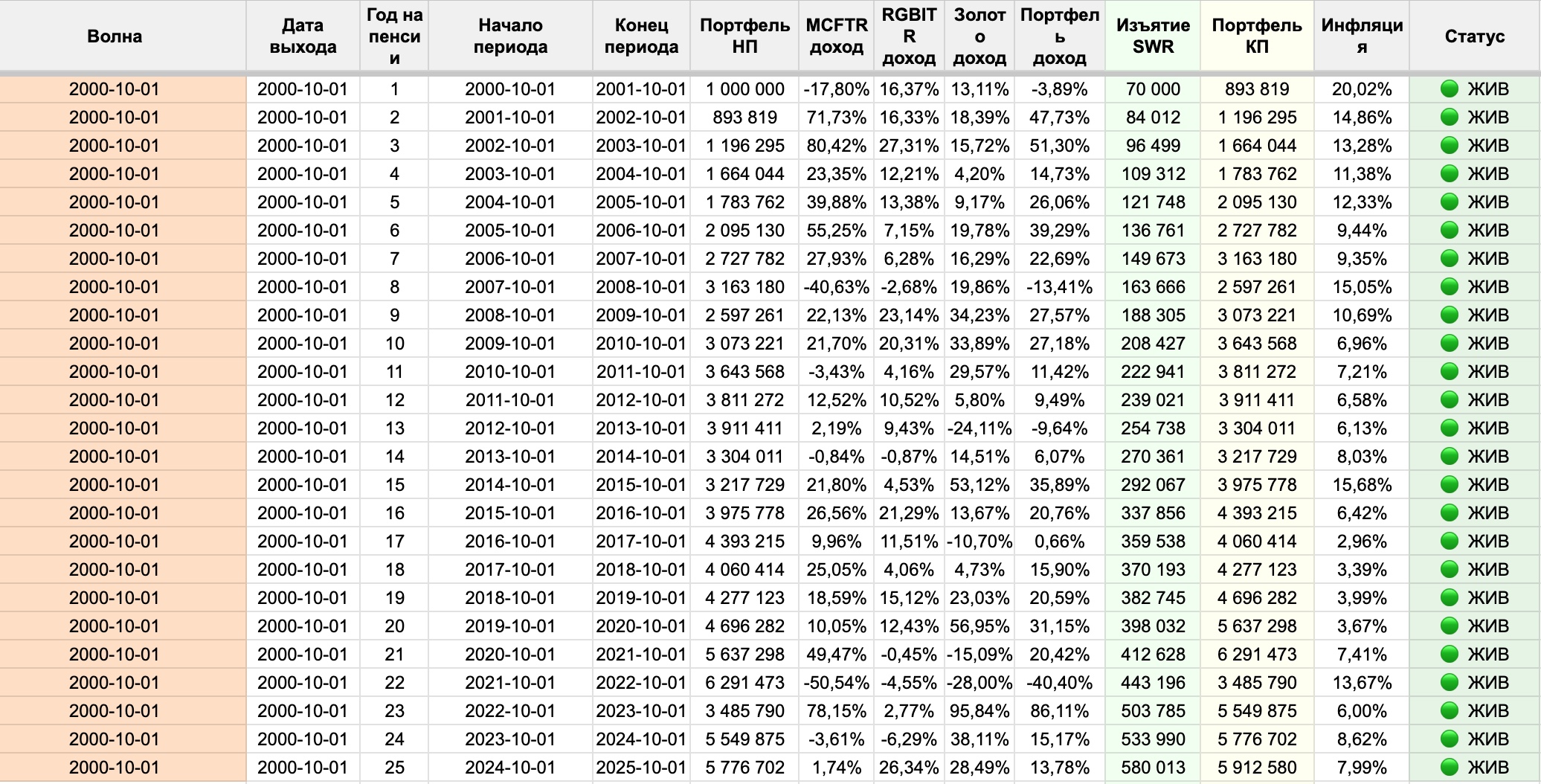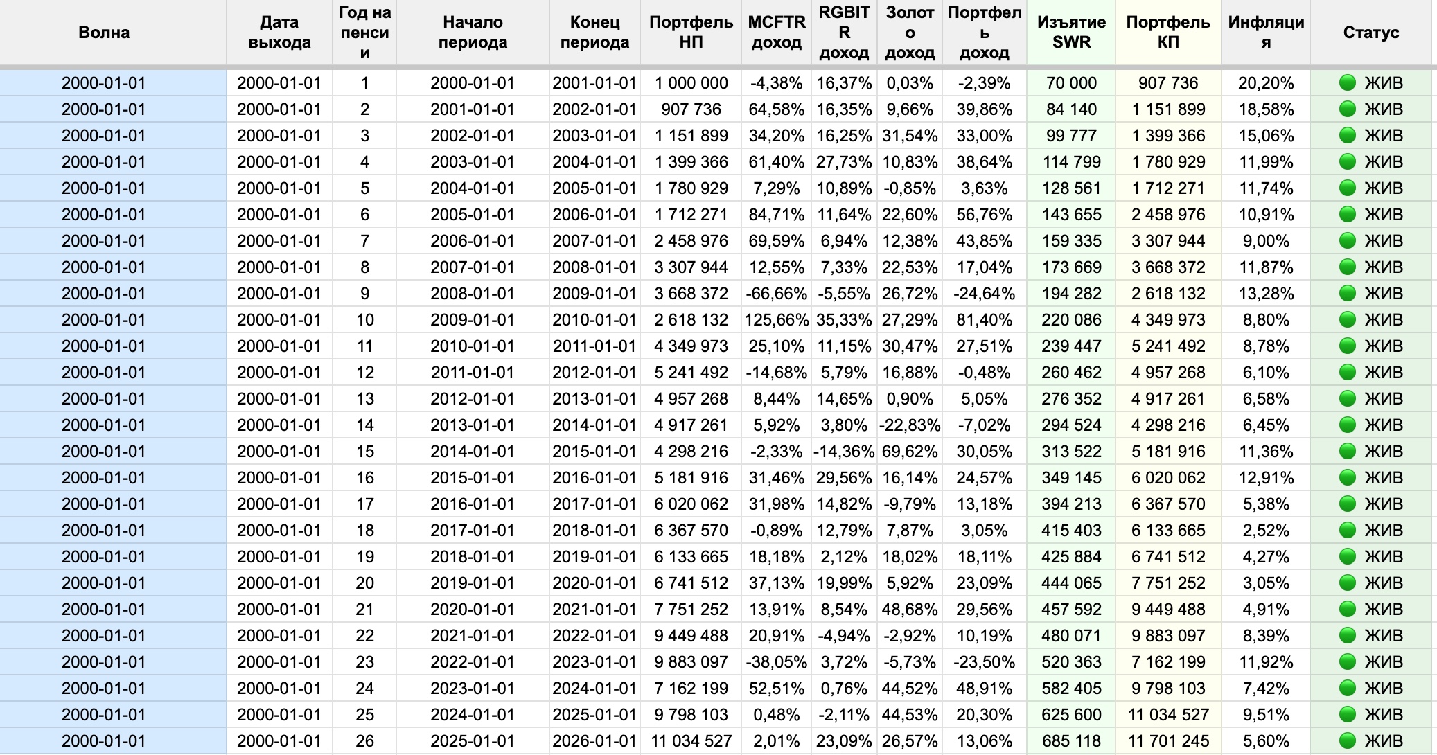 Январский пенсионер. Первый год (с 1 января 2000 по 1 января 2001): доходность (колонка «Портфель доход») -2.39%. Небольшое падение — портфель сжался до 907 736 рублей после изъятия 70 000 рублей. Неприятно, но не катастрофа.