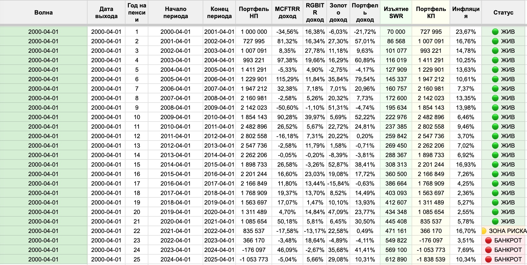 Три даты дают нам понимание: насколько критичен момент выхода на пенсию внутри одного и того же года? Оказывается — очень критичен. Настолько, что разница в три-шесть месяцев может определить, будет ли ваш портфель через 25 лет живым или обанкротившимся.