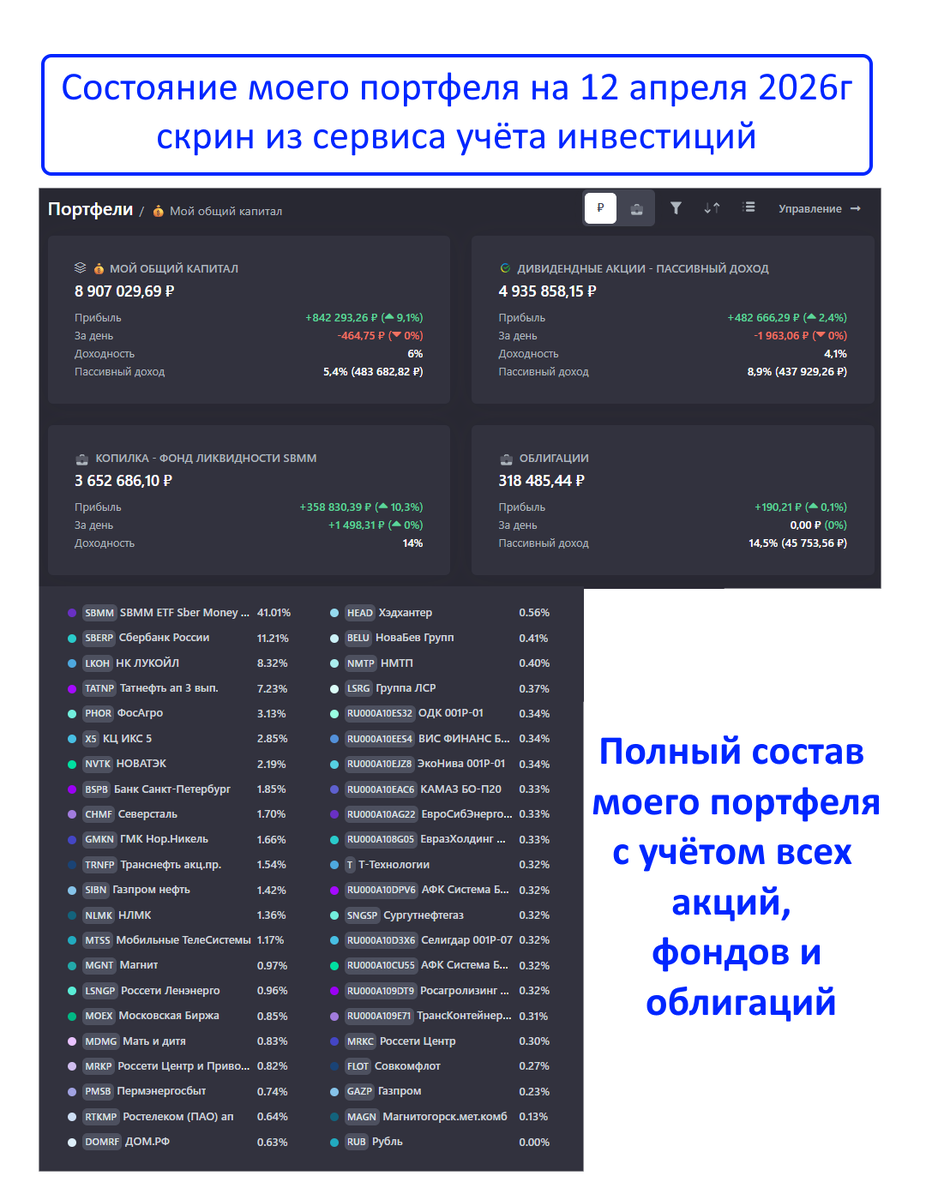 Сразу скажу, в моём портфеле ОФЗ нет, а акции СБЕРА есть (скрин состава портфеля из сервиса учёта инвестиций):