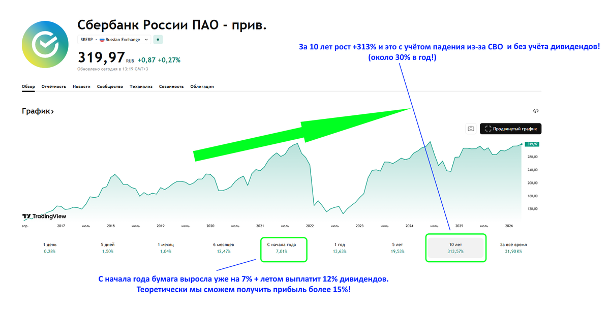 За 10 лет акции СБЕР (преф) выросли на 313%, сильно обогнав инфляцию. И это без учёта дивидендов! С учётом полной доходности (с дивидендами) 462%! Никакая ОФЗ не даст такой доходности.