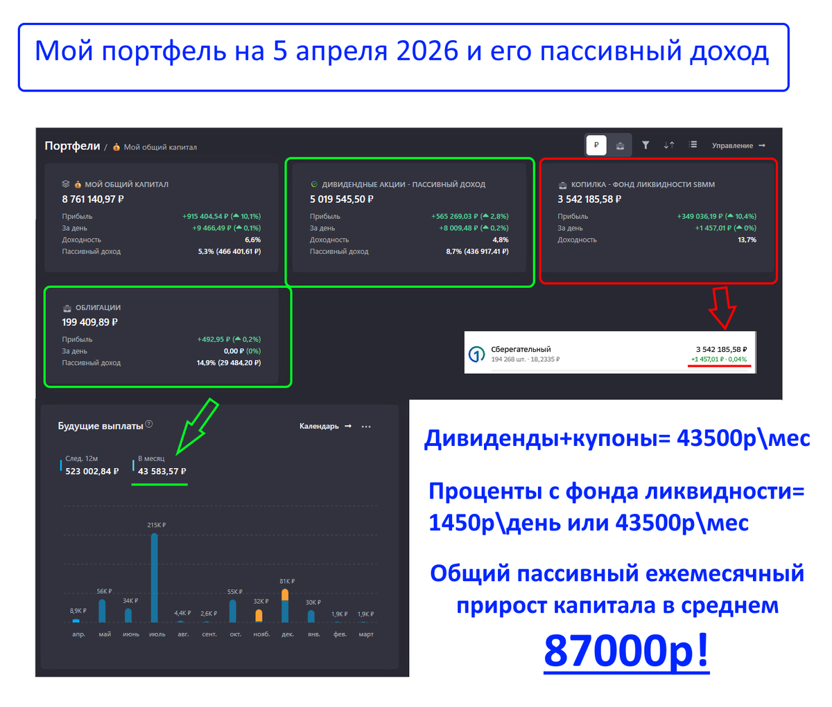 Поэтому я разделяю деньги на два потока: один идёт в долгосрочные инвестиции, другой — в фонд ликвидности (SBMM) для крупных трат. Сейчас в этом фонде уже более 3,5 млн р, и в ближайшем будущем я собираюсь его «откупорить» и использовать.