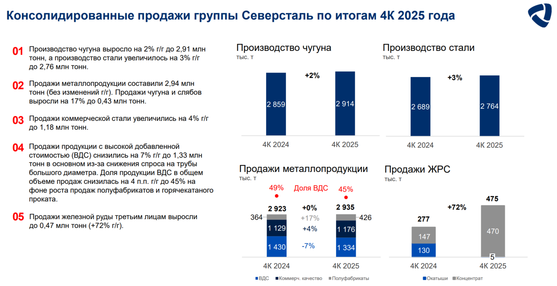 В IV кв. производство чугуна нарастили до 2,9 млн тонн (+2% г/г), стали до 2,8 млн тонн (+3% г/г), это произошло на фоне ремонта доменной печи №5 в прошлом году (низкая база прошлого года). Продажи металлопродукции остались на плато 2,9 млн тонн (+0% г/г) из-за ухода эффекта от приобретения металлотрейдера А-Групп (сделка состоялась в апреле 2024 г.), продажи продукции ВДС (высокая добавленная стоимость) снизились до 1,3 млн тонн (-7% г/г). Как вы можете заметить продажи выше, чем производство, а значит компания распродаёт запасы.