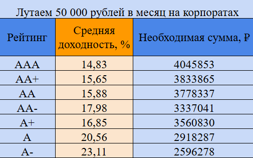 Тут уже повеселее и полегче в плане капитала, который вам необходим для получения денежного потока в размере 50 000 ₽ на каждый месяц. Собрал для вас средние доходности по кредитным качествам эмитента от ААА до А-. Рейтинг ВДО обходим стороной.