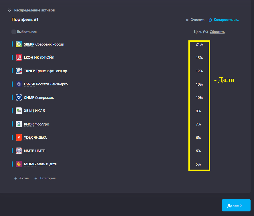Средства были распределены между 10 эмитентами, чтобы соблюдалась и диверсификация и не страдал риск профиль (а у каждого он свой)