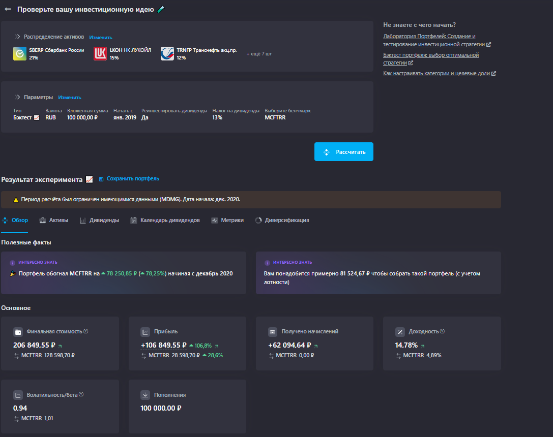 Собранный портфель был мной протестирован в сервисе учета инвестиций (https://snowball-income.com/register/hinterlandinvestor) (за последние 5 лет). Результат на скрине ниже.