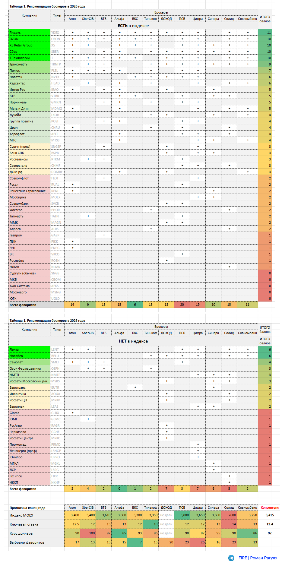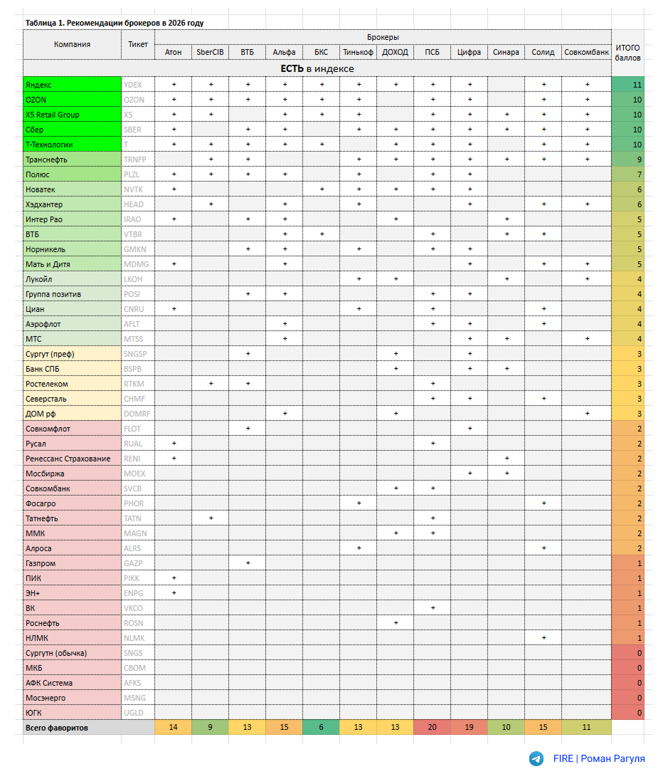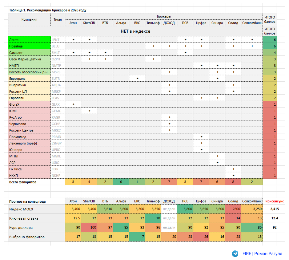 Собрал итоговую таблицу рекомендаций на 2026 год от всех брокеров, кого смог найти. Год назад я уже делал тоже самое и подвёл итоги, выбрав лучших и худших аналитиков, определил наиболее прибыльную стратегию, в этом году попробую её применить.