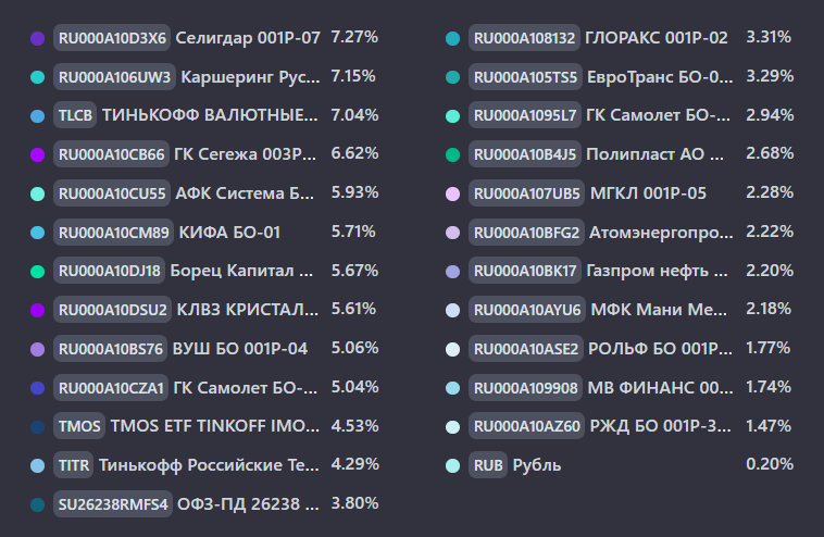 На данный момент в портфеле 21 облигация и 3 фонда: