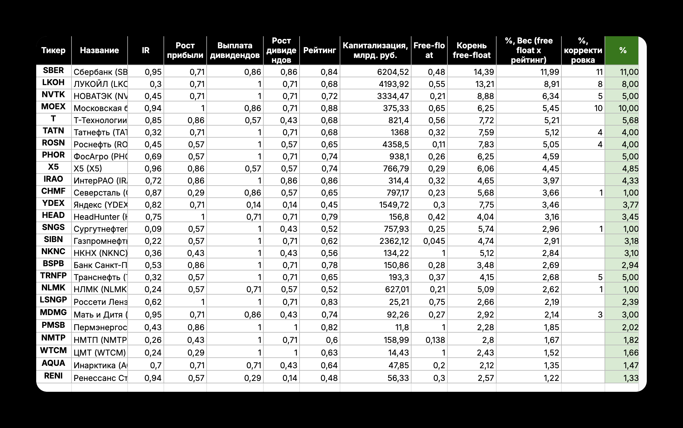 Зачем корень из free float? - Все за тем-же. Это помогает скорректировать взвешивание по free-float, чтобы не дать «гигантам» (типа Сбера или Газпрома) задавить всё остальное, как это происходит в индексе Мосбиржи. Корень смягчает их влияние - и даёт компаниям с меньшей капитализацией, но сильным фундаменталом больше веса.