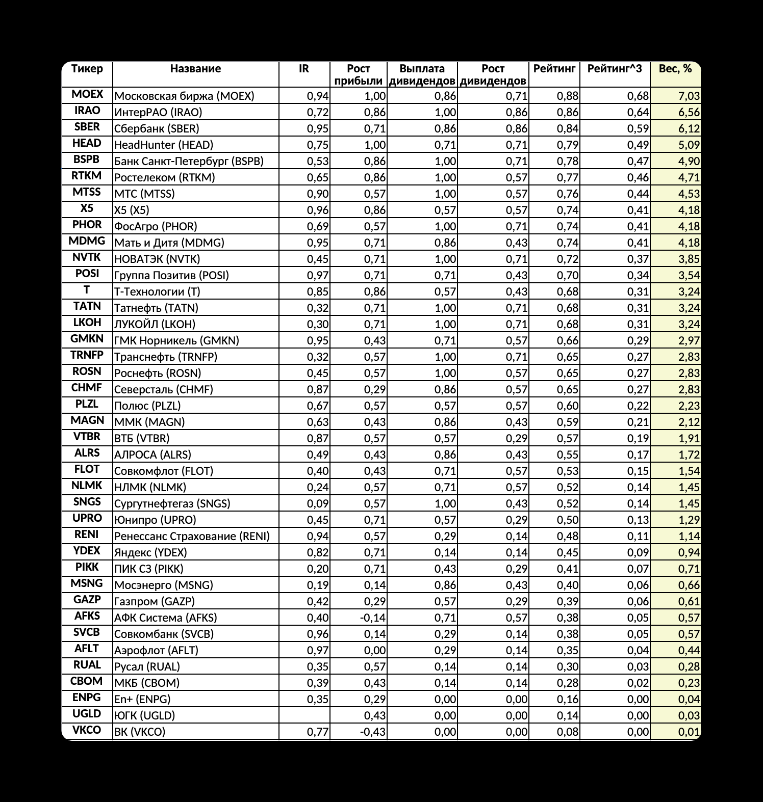 Изменю способ подсчёта веса каждой акции из индекса. Буду рассчитывать вес только на основе рейтинга.