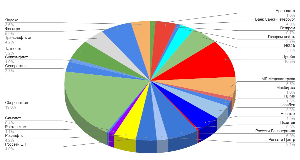 5. Доля акций выросла с 53,1 до 54,9%, облигаций снизилась с 44,9 до 43,5%. Доля фонда денежного рынка+₽ осталась снизилась до 1,3%, доля золота 0,3%. Целевые доли активов на 2025 год следующие: 55% акций, 43% облигаций и 2% золота. Актуальный состав акционной части (на 21.11.2025) можно посмотреть ниже.