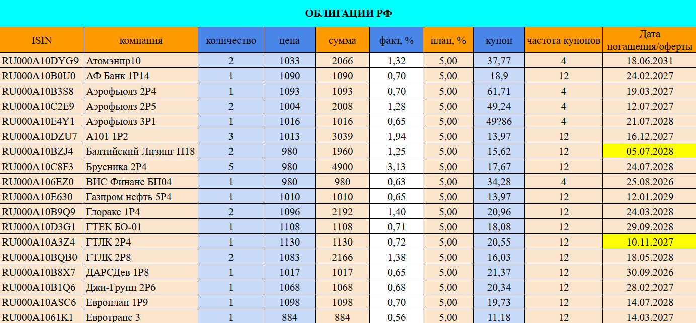 Тут два варианта, которые я собираю. Первый. Для получения стабильного денежного потока каждый месяц. Здесь пришлось собрать шесть выпусков, чтобы закрыть весь год. Более подробно про пассивный доход на ОФЗ писал здесь. Второй вариант – это ОФЗ под переоценку тела облигации в момент снижения ключевой ставки. Тут больше экспериментально, так как горизонт планирования у меня чуть дальше, чем квартал или два, поэтому акцент на рисковые активы (акции, золото).