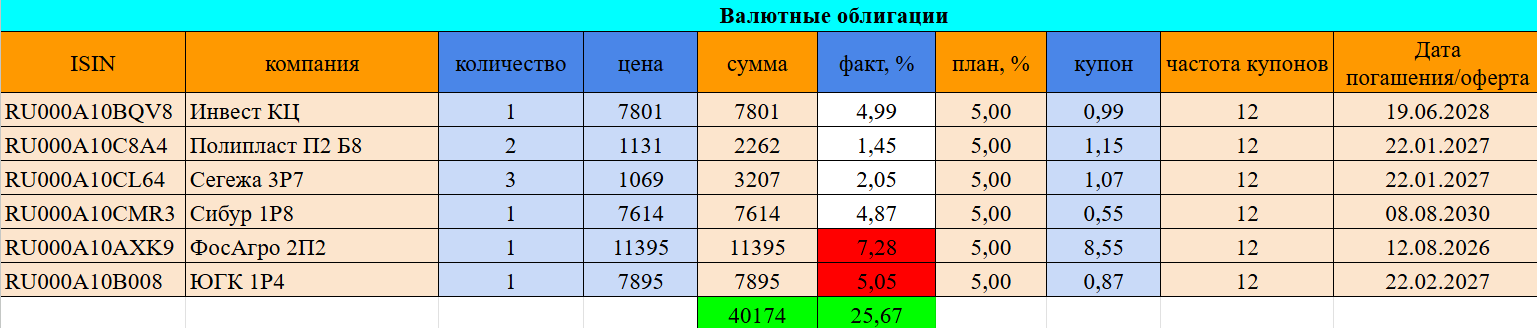 Честно говоря, немного подзабил на эту часть облигационной составляющей, давно не добавлял новых покемонов, выплачивающие купоны с привязкой к валюте. И нет, мой тезис о том, что рублю надо слабеть не потерял актуальности. Тут лишь вопрос времени из серии “когда”, а не “если”. Под девальвацию рубля у меня больше концентрации в акциях с уклоном в экспортеров.