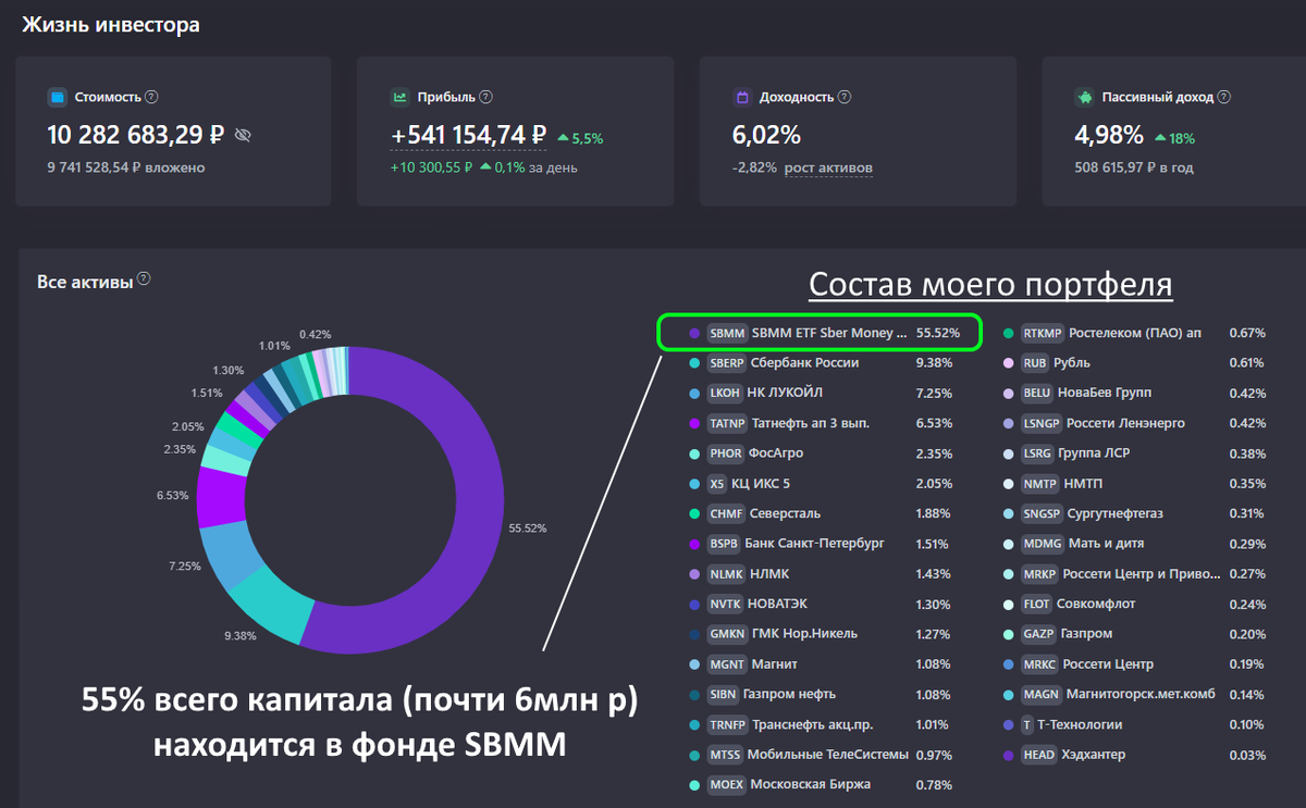 Поэтому я точно не стану покупать SPAY, а продолжу инвестировать в SBMM, ведь сейчас большая часть моего капитала находится именно в этом фонде (скрин моего портфеля из сервиса учёта инвестиций):