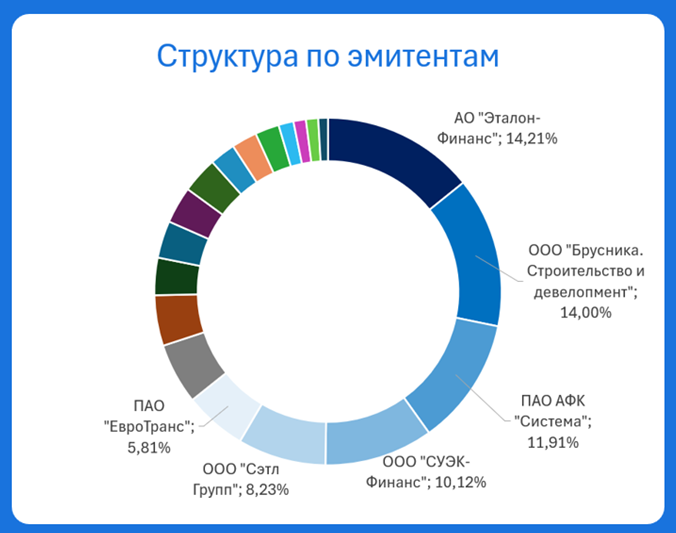 Целевая доля на эмитента – не более 15%. Сегодня самые большие доли представлены Эталоном и Брусникой. ЭталонФин1 в феврале погасится а его доля будет распределена среди лучших на тот момент