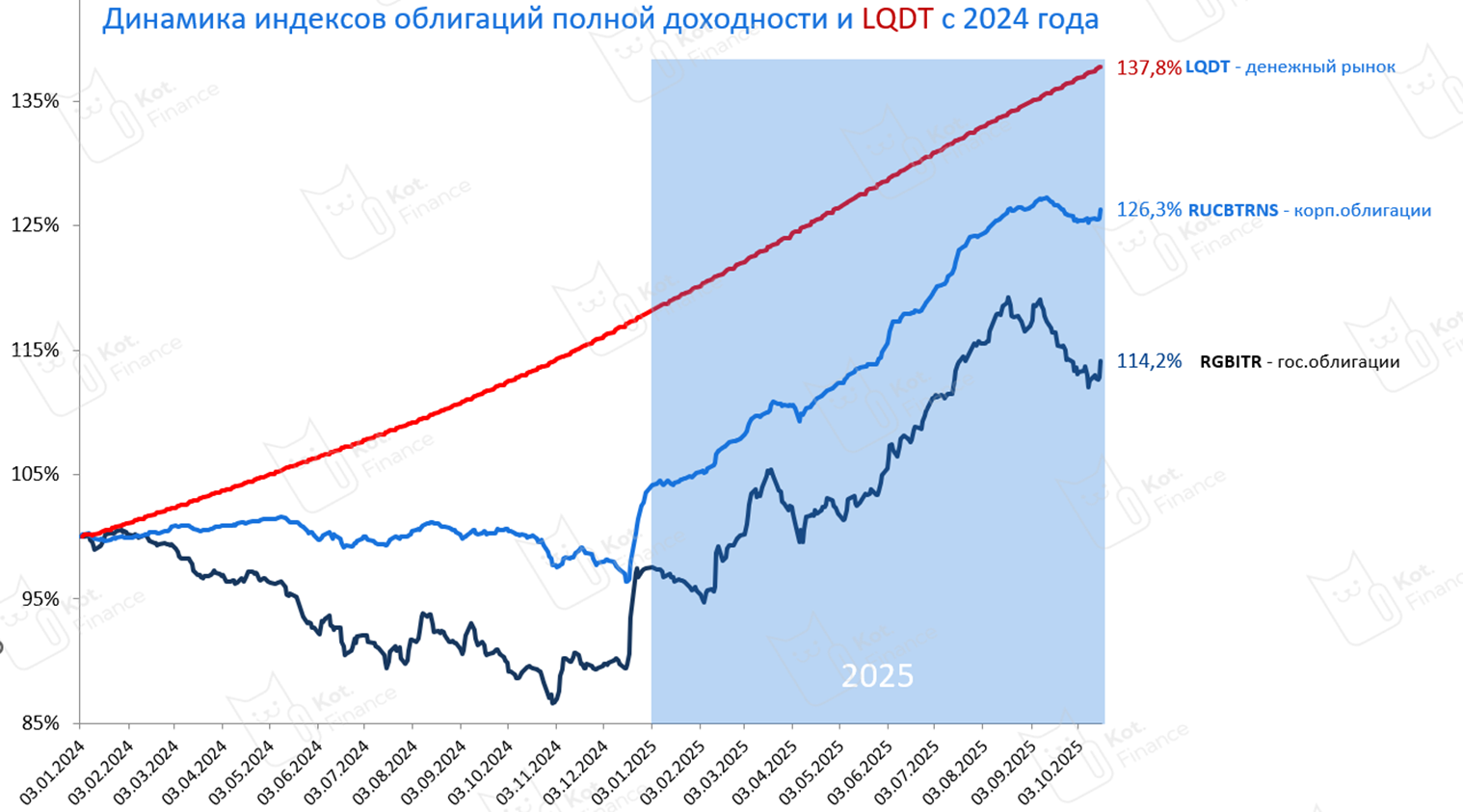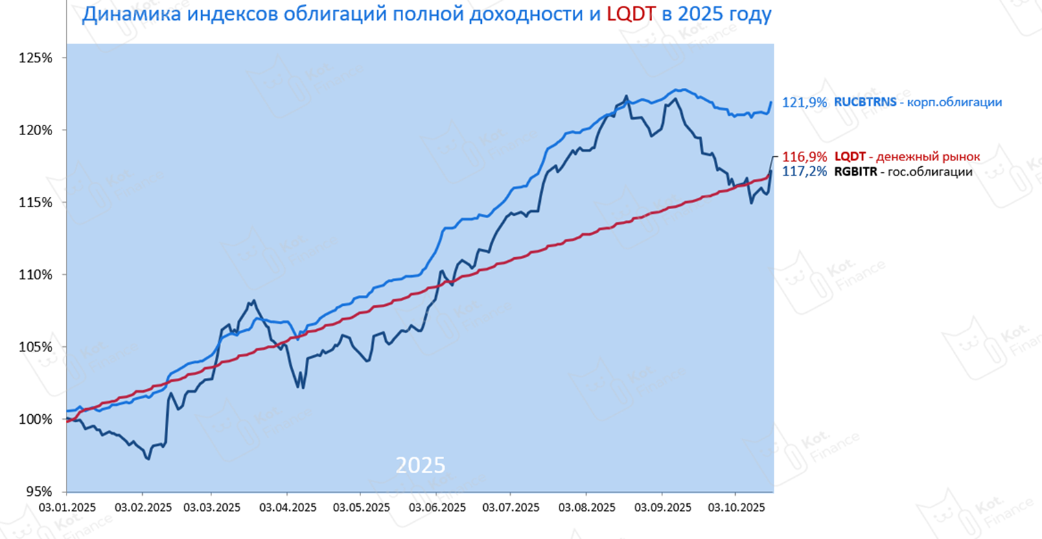 В 2025 году расстановка сил изменилась. LQDT сохранил стабильность, обеспечив доходность, сопоставимую с ОФЗ, но при значительно меньших рисках. Однако корпоративные облигации показали себя оправданным выбором: умеренная волатильность при более высокой итоговой доходности