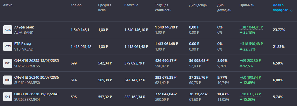 Открыты в конце 2023 года суммарно на 1 413 961 руб. под 12,45%. Занимают 21% от всей массы портфеля и принесли мне уже +318к. В среднем в месяц получается около 14к.