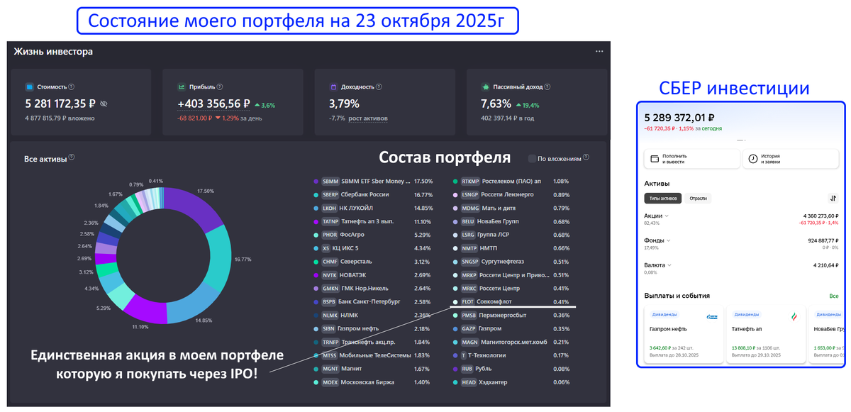Я, за почти 6 лет инвестирования, участвовал лишь в IPO Совкомфлота (мой портфель на скрине из сервиса учёта инвестиций и приложения СБЕР инвестиции):