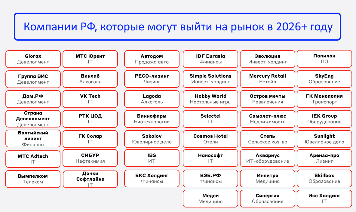 2026г имеет все шансы стать рекордным по количеству и объему IPO в России. Государство будет стараться реализовать "план Путина по удвоению капитализации рынка к 2030г" и подталкивать компании к выпуску своих акций на биржу.