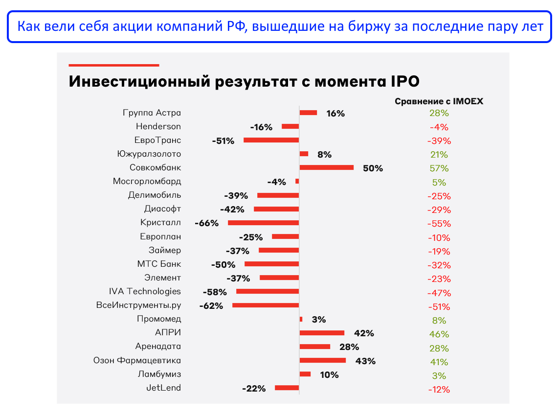 Однако, инвесторам стоит помнить, что участие в IPO не гарантирует прибыль! Успех IPO компаний будет зависеть от снижения ключевой ставки ЦБ и стабилизации геополитики. Именно при реализации двух этих позитивных драйверов наш рынок может начать расти, а вместе с ним можно будет ждать роста и от недавно разместившихся на рынке бумаг.