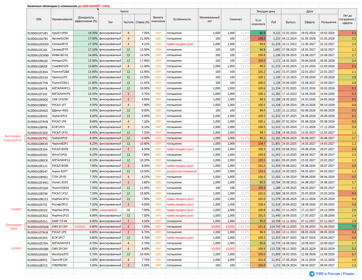 • оптимальный по доходности и сроку в юанях: ОФЗ $RU000A10DQA8 6.8% на 7.5 лет удобный безрисковый ориентир в лице государственного долга или Газпром $RU000A10CP52 8.3% на 1.7 лет в лице корпората.