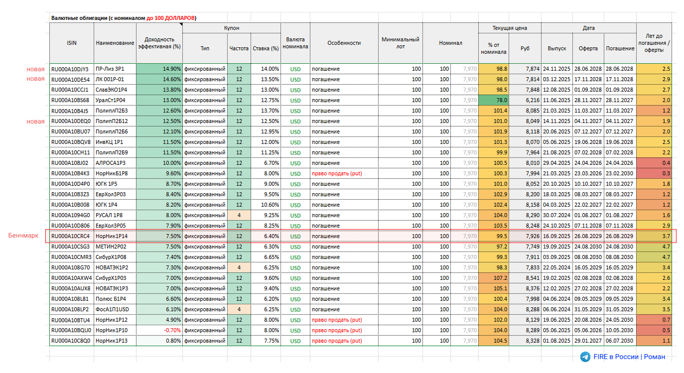 • оптимальный по доходности и сроку в долларах: Норникель $RU000A10CRC4 7.5% на 3.7 лет, т.е. это ориентир оценки адекватности вашего решения, если ставка выше, значит и риск больше.