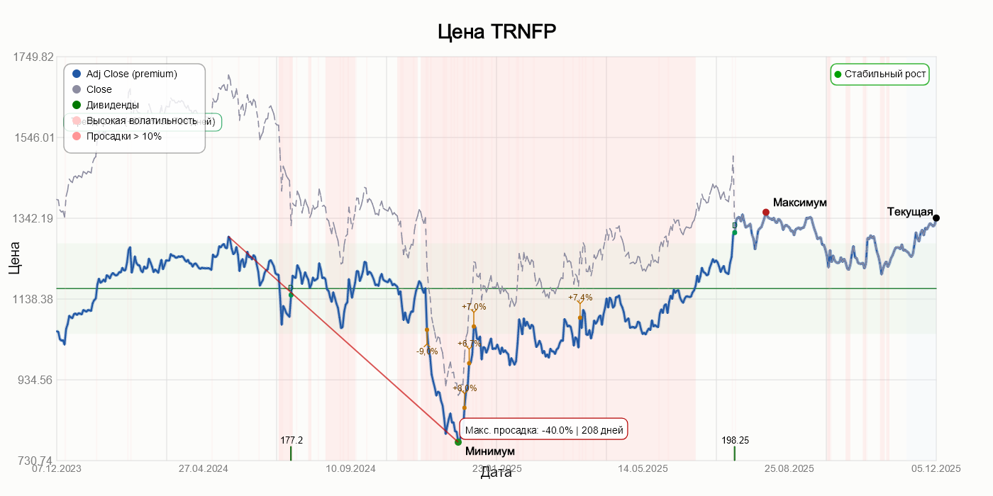Но стоит перейти к поведению котировок — и настроение уже другое. Бумага за последние два года прошла просадку почти в −40%, и самое неприятное, что вытаскивали её из этого состояния очень медленно. График прямо кричит, что TRNFP любит длинные периоды болтанки, резкие проливы и не закрывающиеся дивидендные гэпы