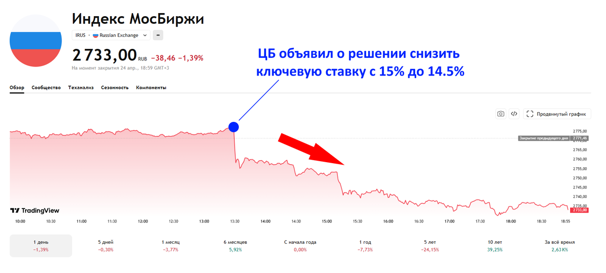 Казалось бы, вот он позитив для фондового рынка. Однако, вопреки ожиданиям, российский рынок акций встретил снижение ставки… падением.